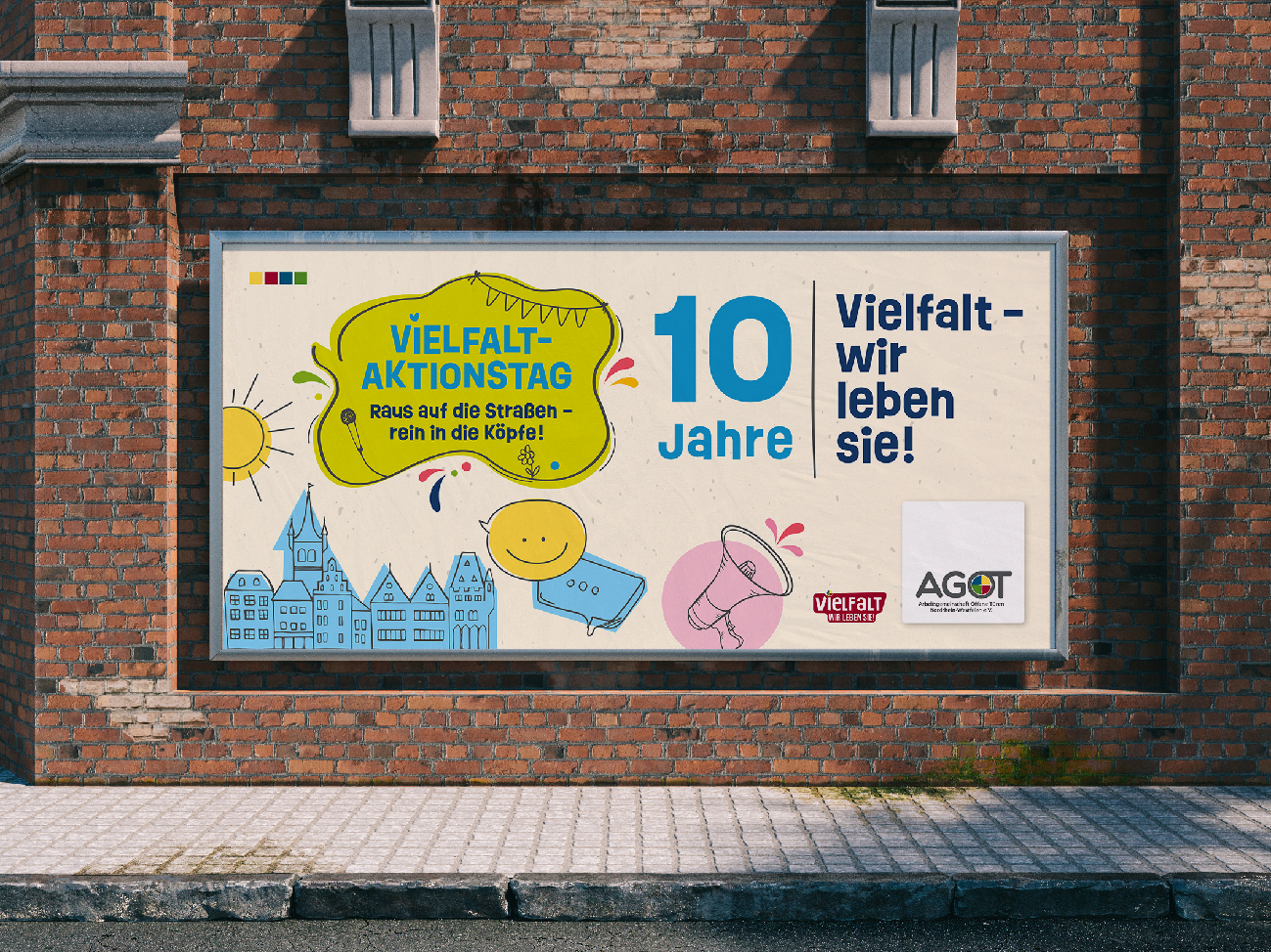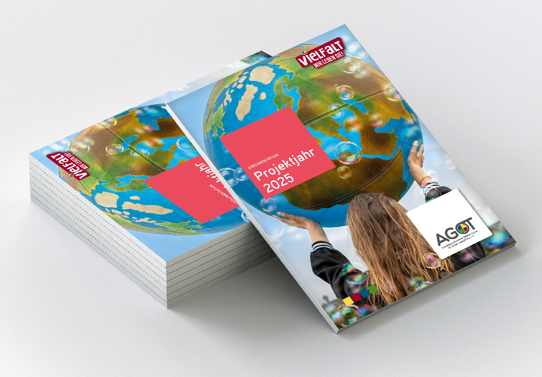 Als gemeinnütziger Verein unterstützt die AGOT-NRW alle Formen der Offenen Kinder- und Jugendarbeit. Das Rahmenprojekt „Vielfalt – wir leben sie!“ widmet sich den Bedarfen junger Menschen mit und ohne Fluchtgeschichte, indem es diversitätssensible Projekte in Einrichtungen für Jugendliche fördert. Jedes Jahr erscheint eine Jahresdokumentation, die zahlreiche Aktionen in einer übersichtlichen Broschüre bündelt. Seit 2023 erstelle ich dafür die Illustrationen, gestalte diese Broschüre aktiv mit und unterstütze das Organisationsteam im Bereich Social Media.